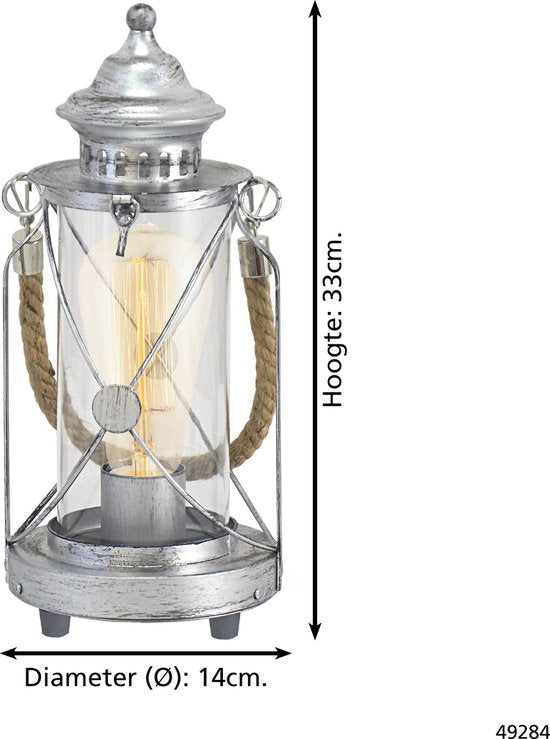 Deze EGLO tafellamp is een rustieke vintage lamp gemaakt van staal met een antiek zilvere afwerking en helder glas. Deze tafellamp met E27 fitting wordt geleverd exclusief lichtbron en is geschikt voor een maximaal wattage van 25W. De lamp is voorzien van een snoerschakelaar en uitermate geschikt voor toepassing in o.a. woonkamer, slaapkamer en zitkamer.
