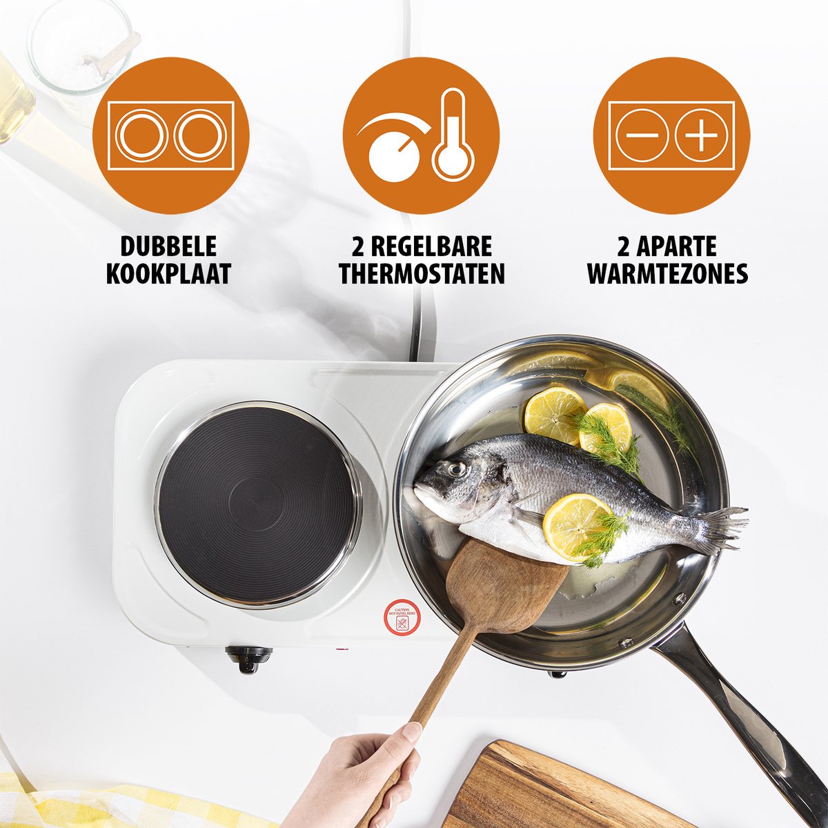 De antislipvoetjes onder de kookplaat zorgen ervoor dat deze stevig op zijn plek blijft staan tijdens het koken. De hittebestendige behuizing voorkomt dat het apparaat aan de buitenzijde te warm wordt, wat extra veiligheid biedt tijdens het verplaatsen. Met een vermogen van 2500 watt is de kookplaat geschikt voor elk standaard stopcontact.